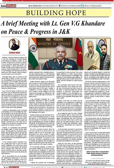 Building Hope, A brief Meeting with Lt. Gen V.G Khandare on Peace & Progress in J&K: Zaman Noor